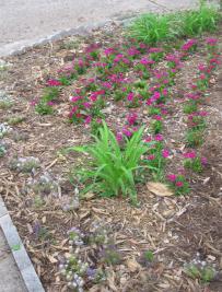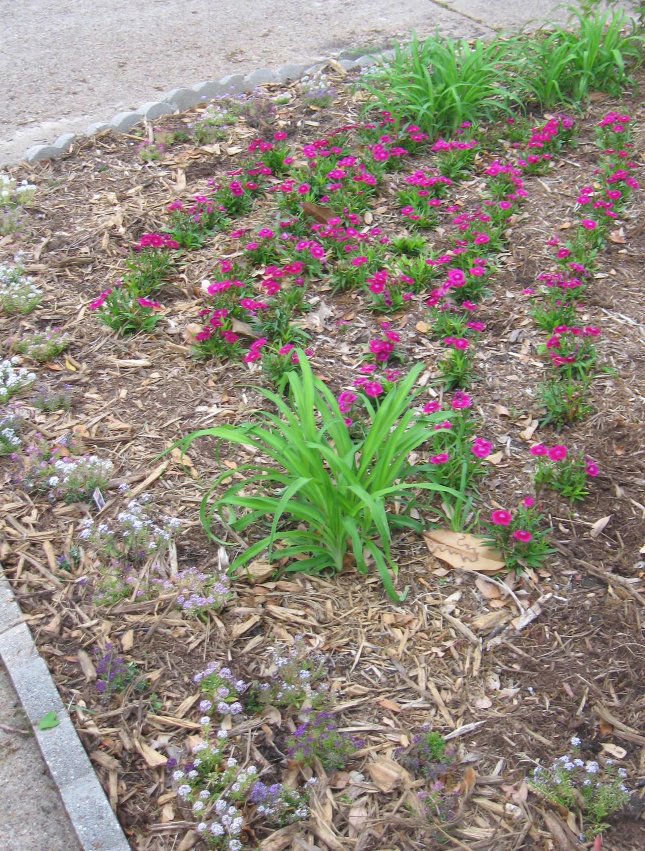 e had such a wet winter and mild spring that things are blooming in a way they didn’t before. There’s new growth on the holly in the front. The monkey grass is looking amazing. The pinks from last fall are huge. And the irises have spread! Things are starting to look halfway decent.