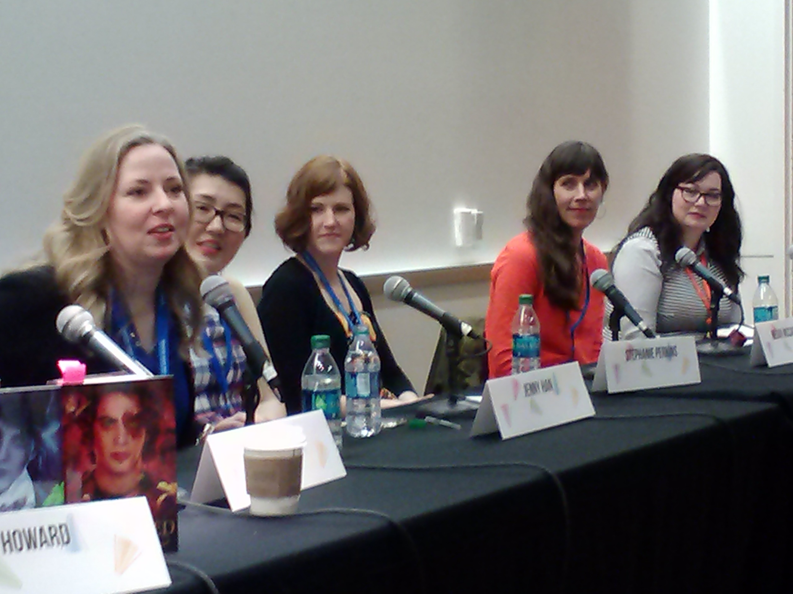 My friend Mandy moderated the “Book Boyfriends 101” session featuring authors A. G. Howard, Megan McCafferty, Jenny Han, Stephanie Perkins, and Ally Carter. I’ve read 4 of the 5, and must say I am completely smitten with Jenny Han and Stephanie Perkins, so this session was a high priority for me. Luckily, I happened to run into Mandy right before her session. As we headed to her room, the hallway got more and more crowded and we realized–they were all trying to get into that session. Mandy pushed her way through, and I was right behind her. She got into the room by saying “I’m the moderator,” and I got into the room by saying “I’m with the moderator.” Yes, I totally cut off hundreds of rabid fangirls. I do feel guilty, but I was also the official session photographer. I had a job! I grabbed a seat on the first row. Five minutes later, the volunteers asked any adults “who didn’t have to be here” to please leave. I shrunk down in my seat and tried to look as young as possible.