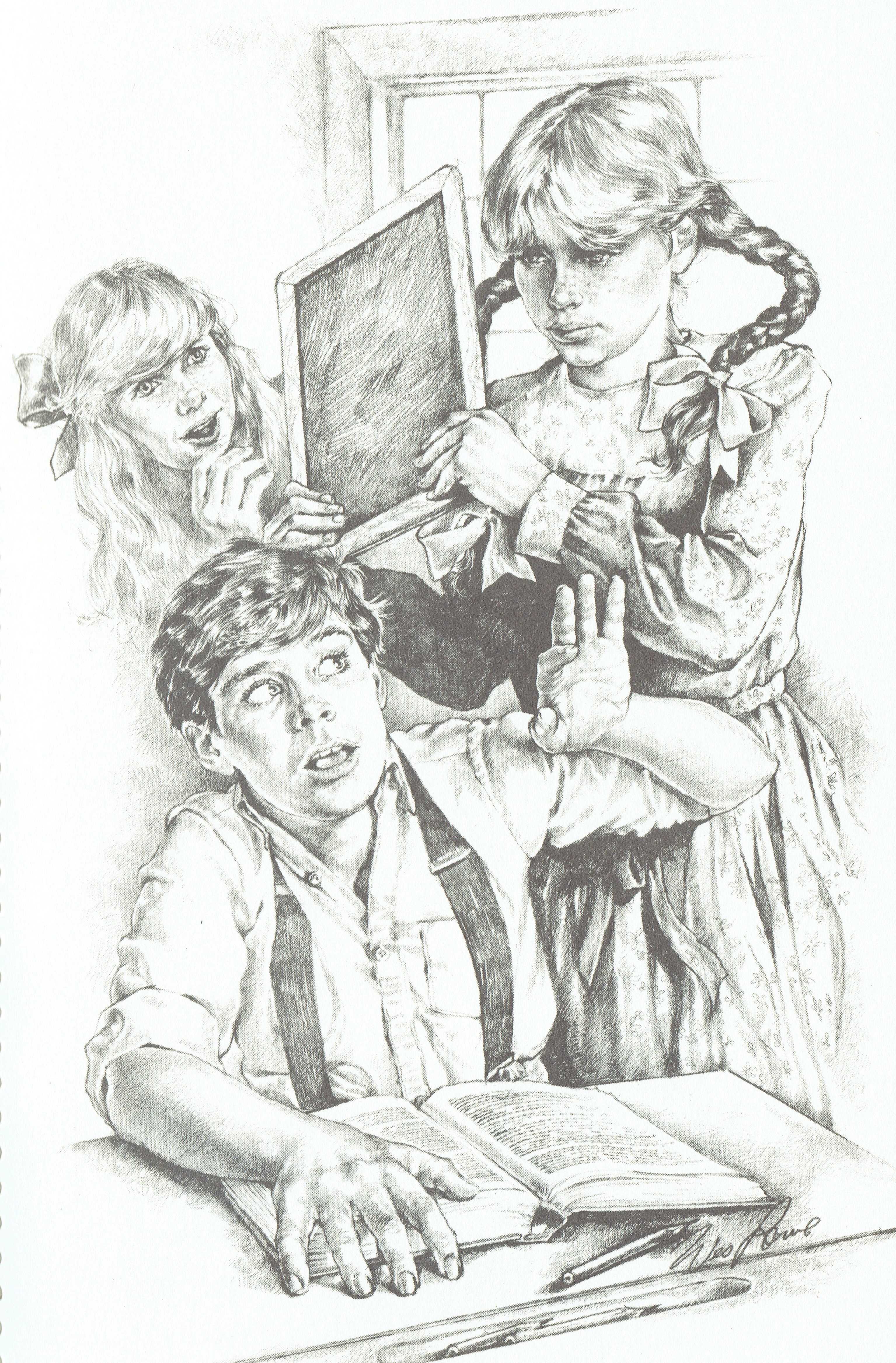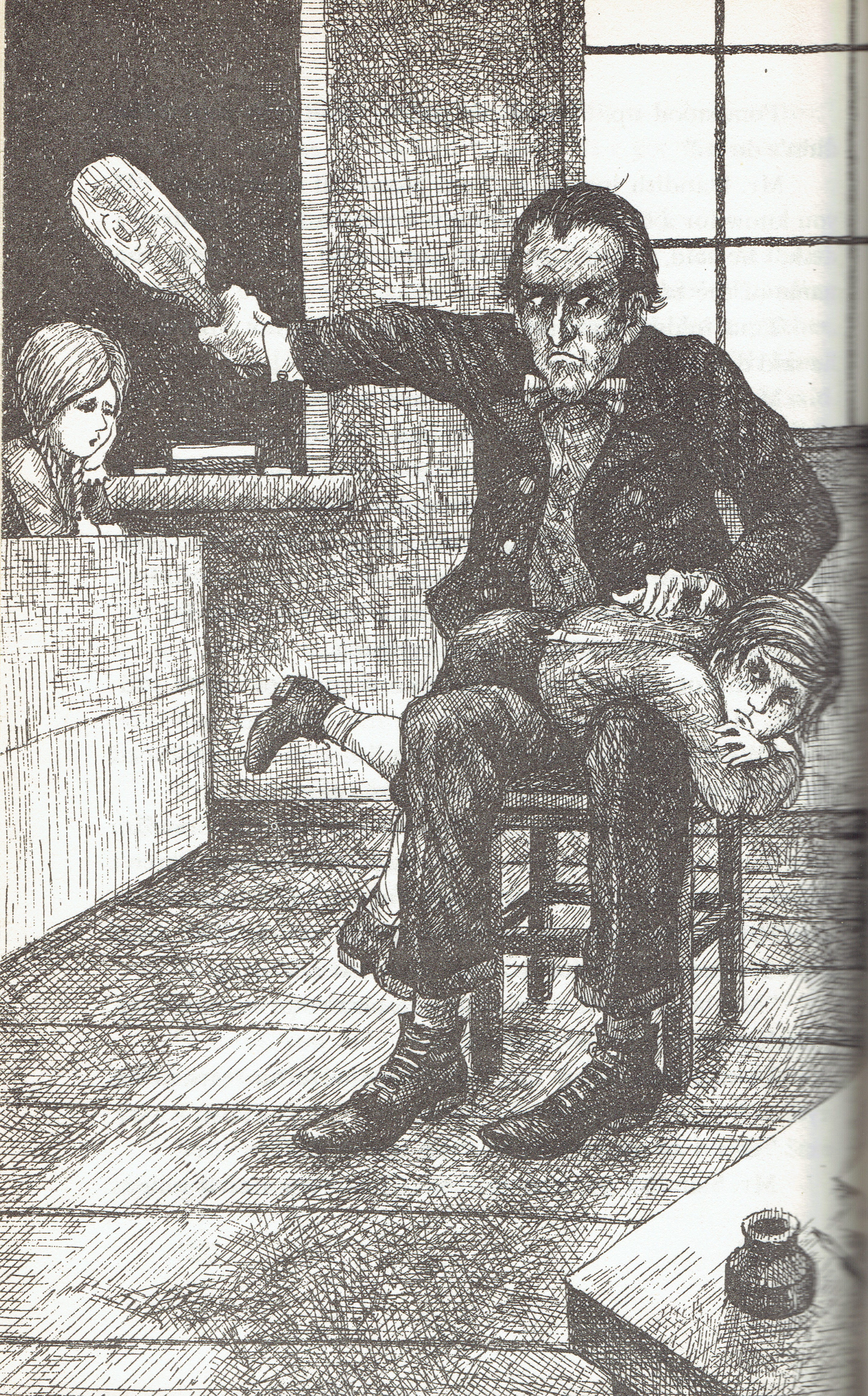 And I found two pictures of teachers dealing with mischief. There’s this illustration from These Happy Golden Years