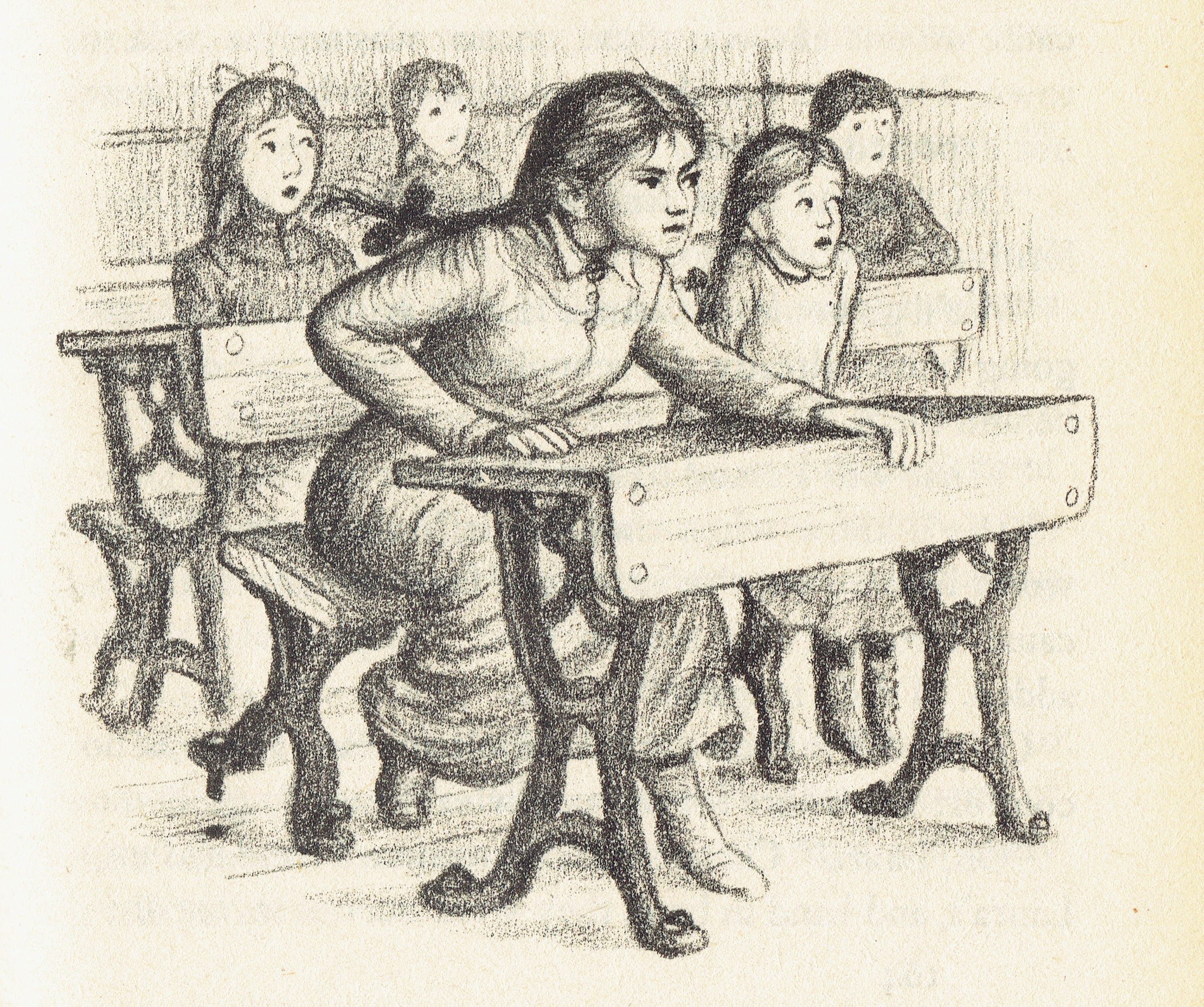 And I wanted at least one illustration of someone writing lines on a blackboard. Just when I had about given up hope, All-of-a-Kind Family Downtown by Sydney Taylor supplied the perfect little illustration in a chapter called “The Wrong Side of Bed”